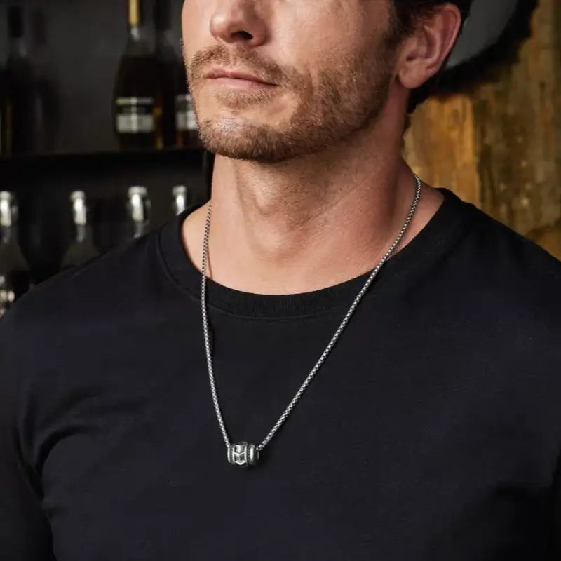 Dimensions : Le pendentif a un diamètre d’environ 14 mm et la chaîne est disponible en trois longueurs : 55 cm, 60 cm et 65 cm, convenant ainsi à la plupart des tours de cou masculins. Idéal pour les hommes privilégiant un style robuste et fonctionnel, les passionnés de mode à la recherche d’accessoires texturés originaux et ceux qui souhaitent offrir un cadeau chargé d’aura et de symbolisme.