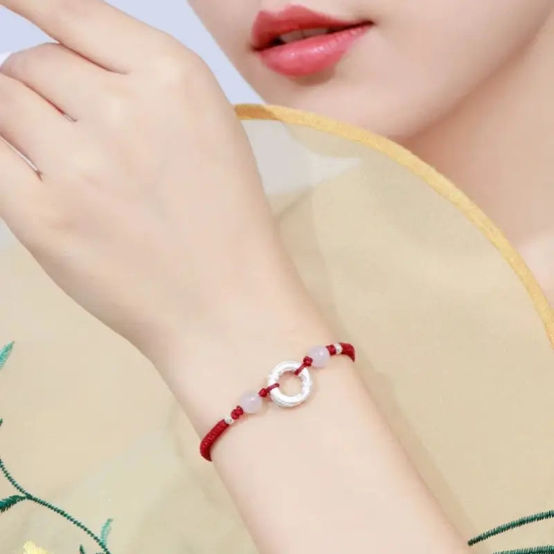 - Design : Boucle de la paix en argent fin 999 avec motif tournant (« Turn Fortune »), cordons tressés rouges/noirs, longueur ajustable, style simple et élégant.