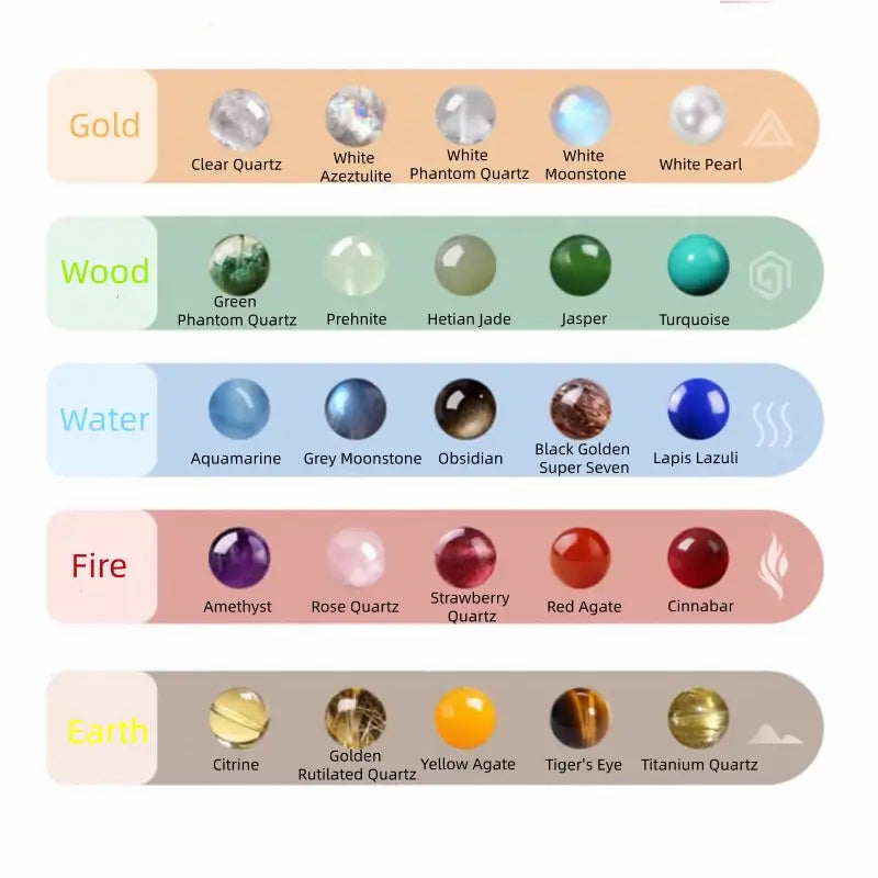 - クリスタルヒーリングの特性:金属(浄化/集中力); 木(成長/キャリア); 水(穏やかさ/感情の鎮静); 火(活力/勇気/行動); 土(富/安定/豊かさ)