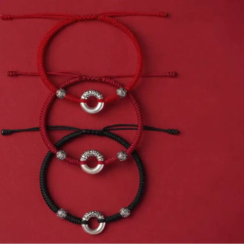 This elegant 999 Fine Silver Peace Buckle & Silver Coin Fortune Bead Bracelet is crafted with 999 fine silver, featuring a revolving-pattern peace buckle and silver coin fortune-turning beads, paired with 3 color options of braided cords (red, black, dark red). The peace buckle has a diameter of approximately 15mm, and the bracelet length is freely adjustable to fit most wrist sizes.